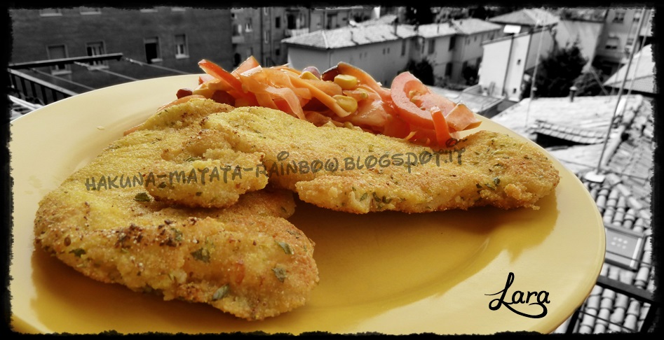 In questa ricetta non ho messo le dosi, sono andata a occhio, la panatura che mi avanza la tengo in un contenitore chiuso e la utilizzo per rifare queste fettine o per farle altre impanature belle croccanti con verdure. Per prima cosa prepariamo i piatti con gli ingredienti, tre piatti. Nel primo la farina, nel secondo l'uovo sbattuto con un pò di latte, nel terzo parmigiano, farina di mais e pangrattato nella stessa quantità, origano e salvia (fatti rinvenire un pò in qualche goccia d'acqua poi strizzati) e mescolare bene per amalgamare tutti gli ingredienti. Ora prendiamo la fettina e la passiamo nei vari piatti, prima nella farina, poi nell'uovo e infine nel mix pane e mais, appoggiare sul piano di lavoro e schiacciare un pò con le mani, in modo da far aderire la panatura, lasciare riposare il tempo di preparare le altre. Mettere un pò d'olio in una padella e cuocere le fettine per bene da ogni lato, salare. Servire con una bella insalatona fresca, io ho fatto, carote, pomodori fagioli rossi e mais. Che dire, viene una impanatura perfetta, profumata grazie alle spezie, croccante, non assorbe l'olio e rimane bella compatta senza rompersi e ha sempre un colore d'orato. Questa farina la trovo davvero buona per impanare!