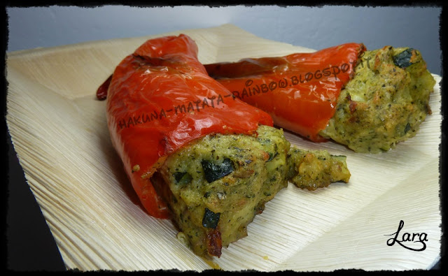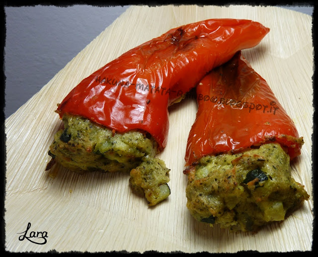 Ho trovato questa ricetta sul blog di Eva&Claudio. Lavare le zucchine, eliminare gli estremi e tagliarle a cubetti piccoli, come dei canditi e tenetele da parte. Tritare l'aglio e lo scalogno e farli appassire in padella con un goccio d'olio. Aggiungere i cubetti di zucchina e lasciarli rosolare a fuoco vivo per 5 minuti, mescolando spesso, spegnere il fuoco e lasciare intiepidire. Lavare i peperoni, tagliare la calotta superiore, per eliminare il picciolo, eliminare anche i filamenti bianchi e i semi all’interno. Preparare la farcia mettendo nel mixer le fette di pane e le erbe aromatiche. Versare il tutto in una ciotola e aggiungere il formaggio grattugiato e l’uovo sbattuto, mescolare bene, regolare di sale e pepe e incorporare anche le zucchine saltate. Mescolare affinché la farcia risulti omogenea e farcire i peperoni, riempendoli al loro interno con l'aiuto di un cucchiaio o delle mani. Versare sulla superficie un filo di olio e infornate in forno già caldo a 180° per 45 minuti circa. Lasciare leggermente intiepidire prima di servire a tavola. Se li volete ancora più leggeri, appena usciti dal forno potete eliminare la pelle che verrà via molto facilmente. Li ho serviti su un piatto in foglia di palma EcoBioShopping.